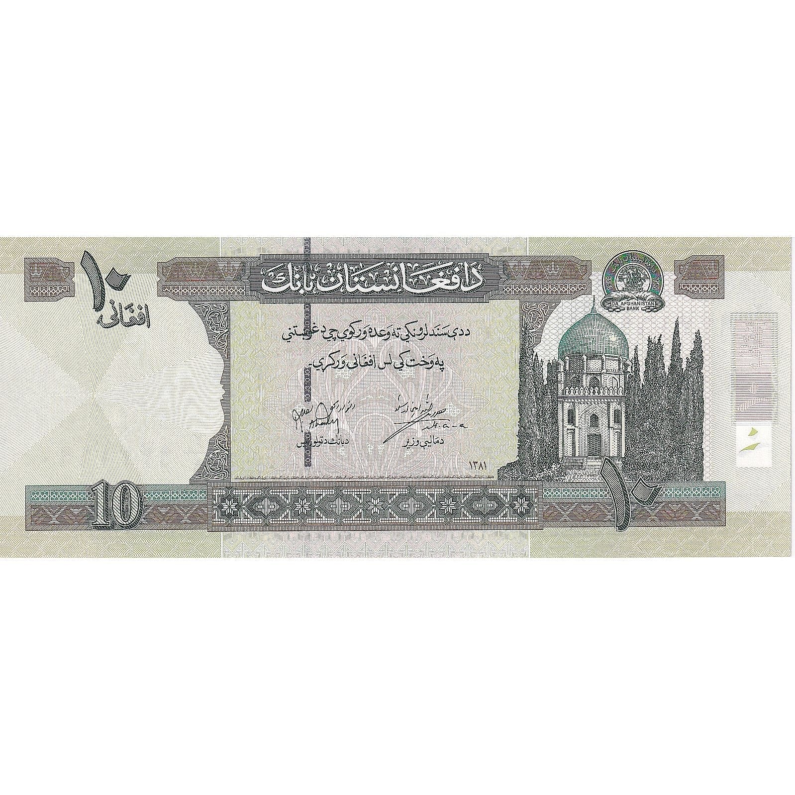 Mausoleo de Ahmed Shah Durrashi en Kandahar a la derecha. Arco de la Victoria en los Jardines Paghman, cerca de Kabul, en el centro. Verde y marrón sobre fondo multicolor.