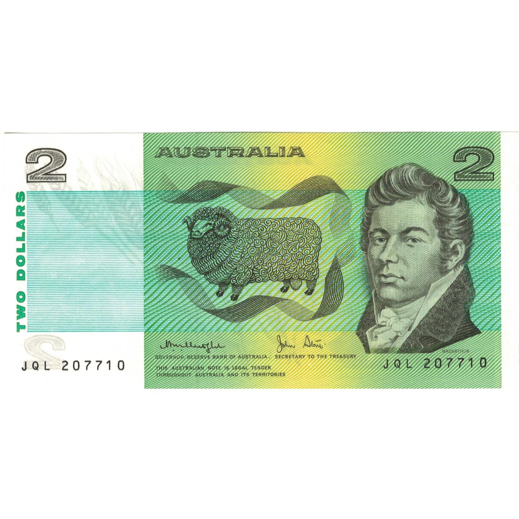 John MacArthur a la derecha, oveja en el centro, con el texto: "COMMONWEALTH OF" en el encabezado. William Farrer a la izquierda, trigo en el centro. Negro sobre fondo multicolor verde, azul y amarillo.