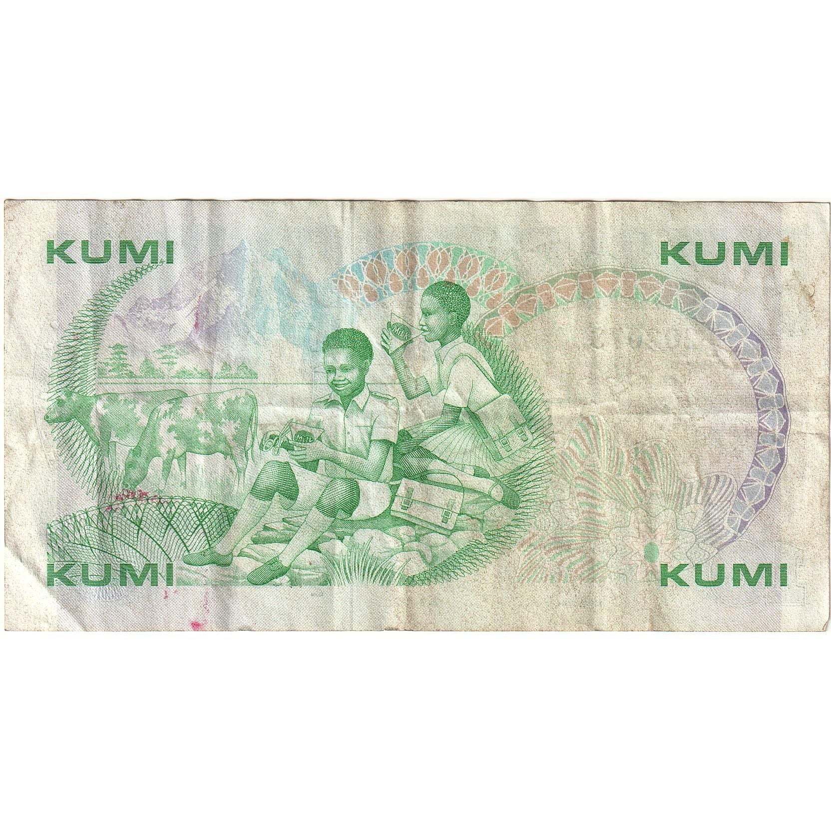 Escudo de armas al centro. Presidente Daniel Toroitich Arap Moi a la derecha. Dos vacas a la izquierda, dos escolares bebiendo leche al centro. Verde, azul y marrón sobre fondo multicolor.