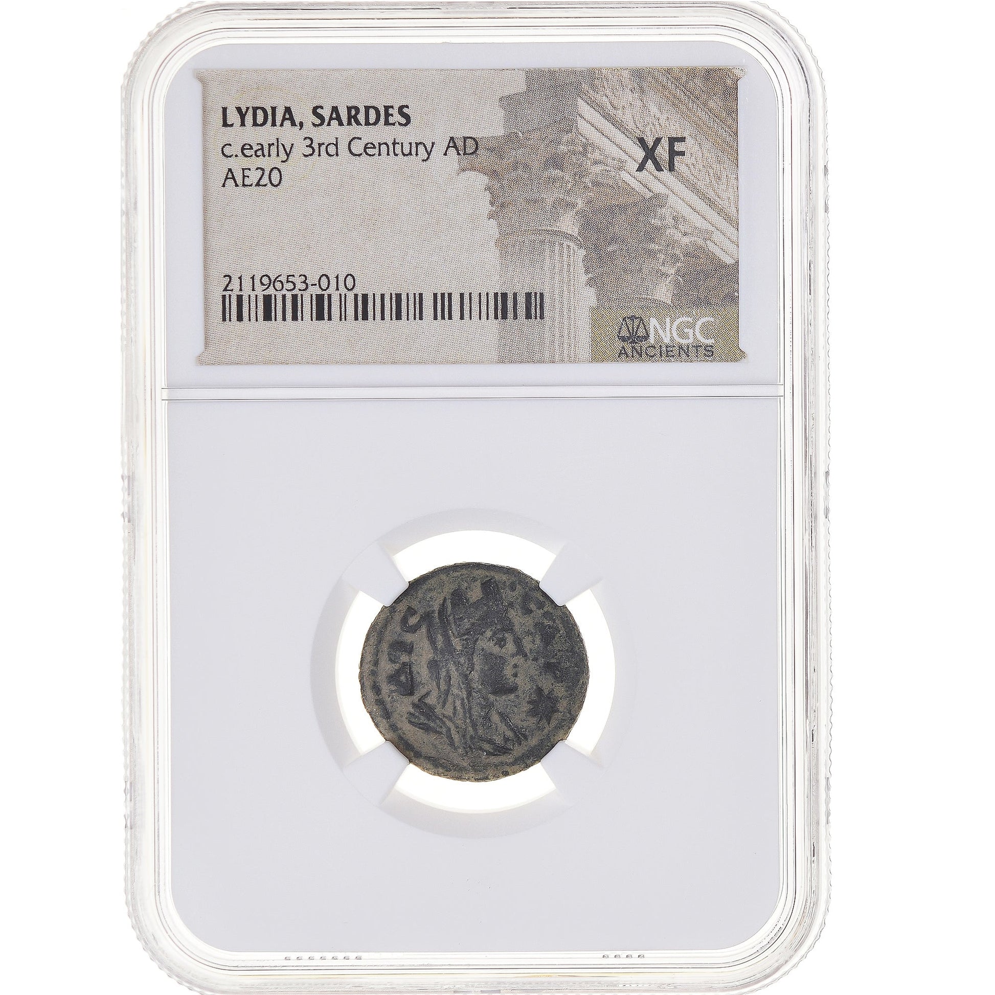 Estatua de Core de pie, de frente; espiga a la izquierda, amapola a la derecha.