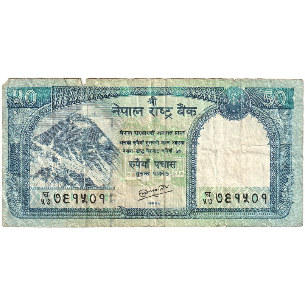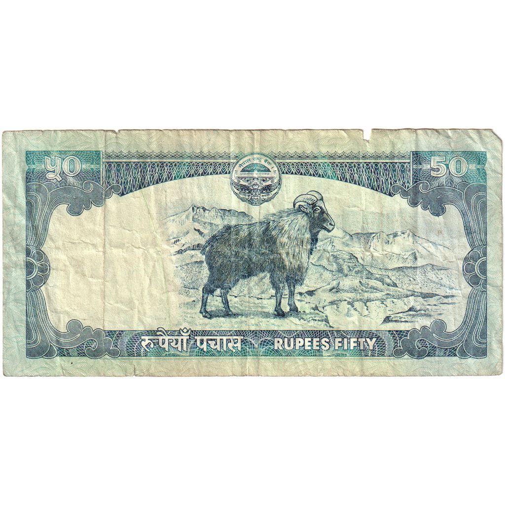Retrato del rey Gyanendra Bir Bikram a la derecha, con el edificio en el centro. Firma de Tilak Rawal. Tahr del Himalaya en el centro. Negro y azul sobre fondo multicolor.
