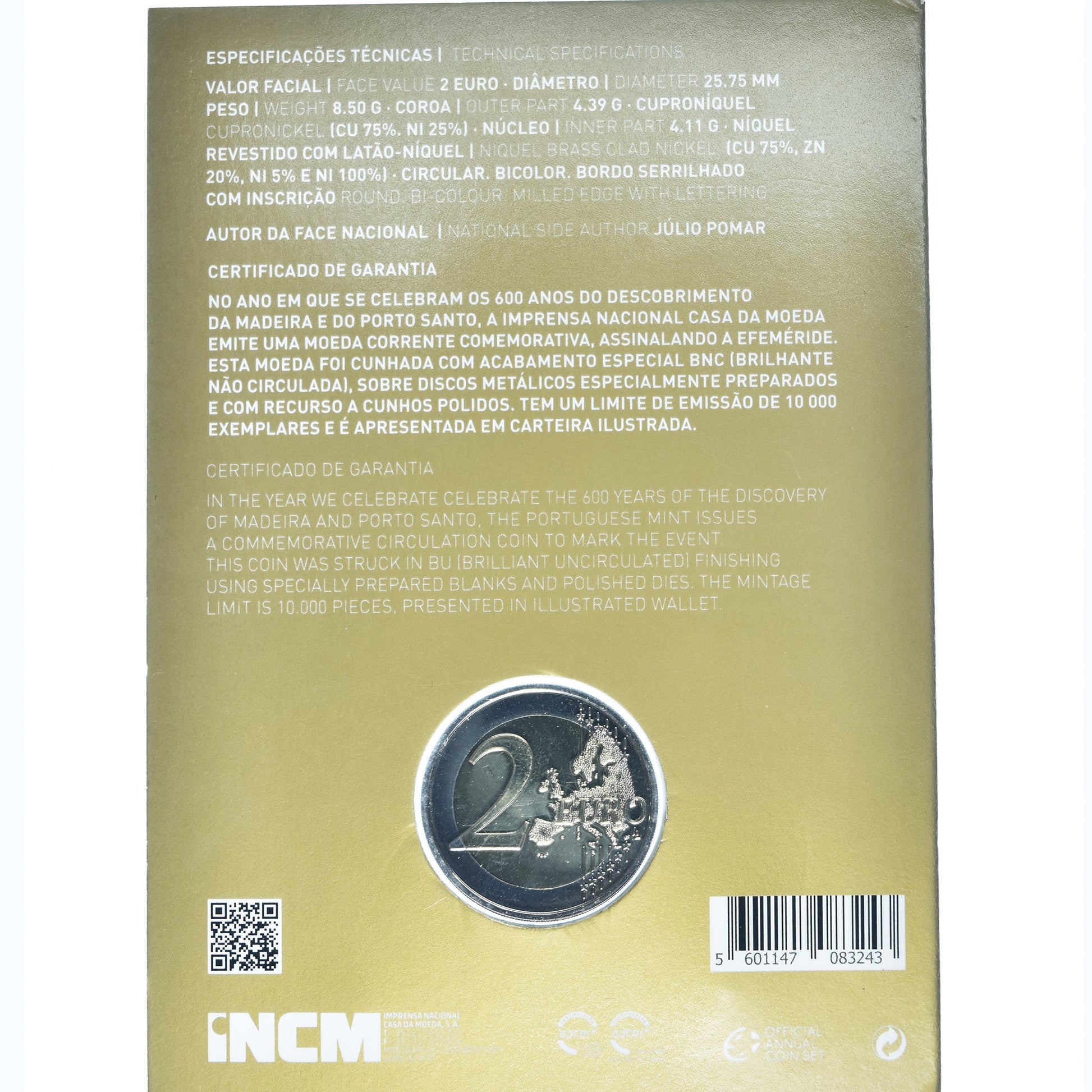 Portugal, 2 euros, 600 años Madeira Porto Santo